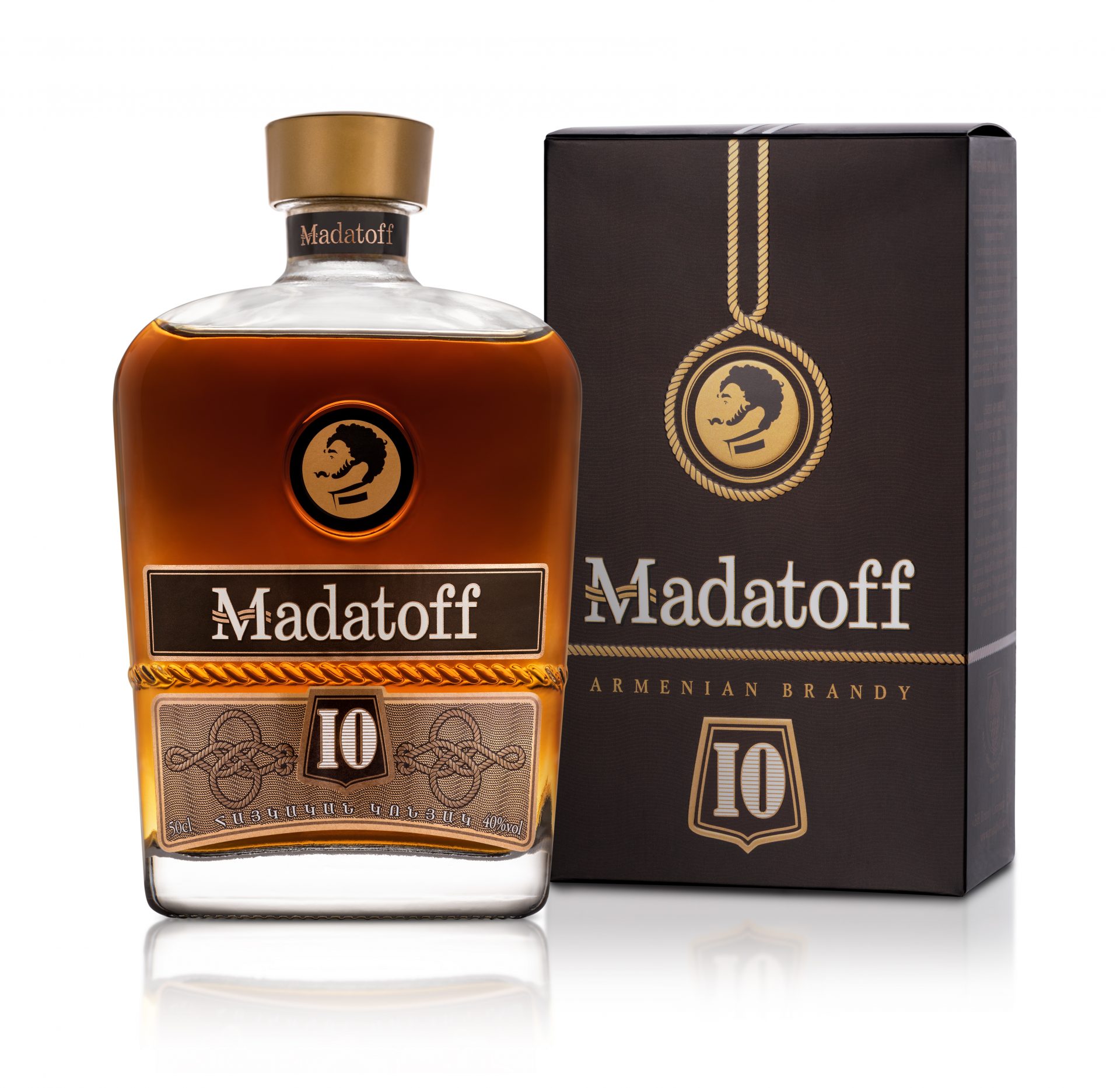 Der 10 Jahre alte armenische Brandy Madatoff hat eine schöne Bernsteinfarbe mit einem leichten Hauch von Kupfer.  Im Bouquet dominiert der Geschmack von Walnuss und Eiche.  Der finale süße Geschmack entwickelt sich langsam und hinterlässt einen langen Nachgeschmack.